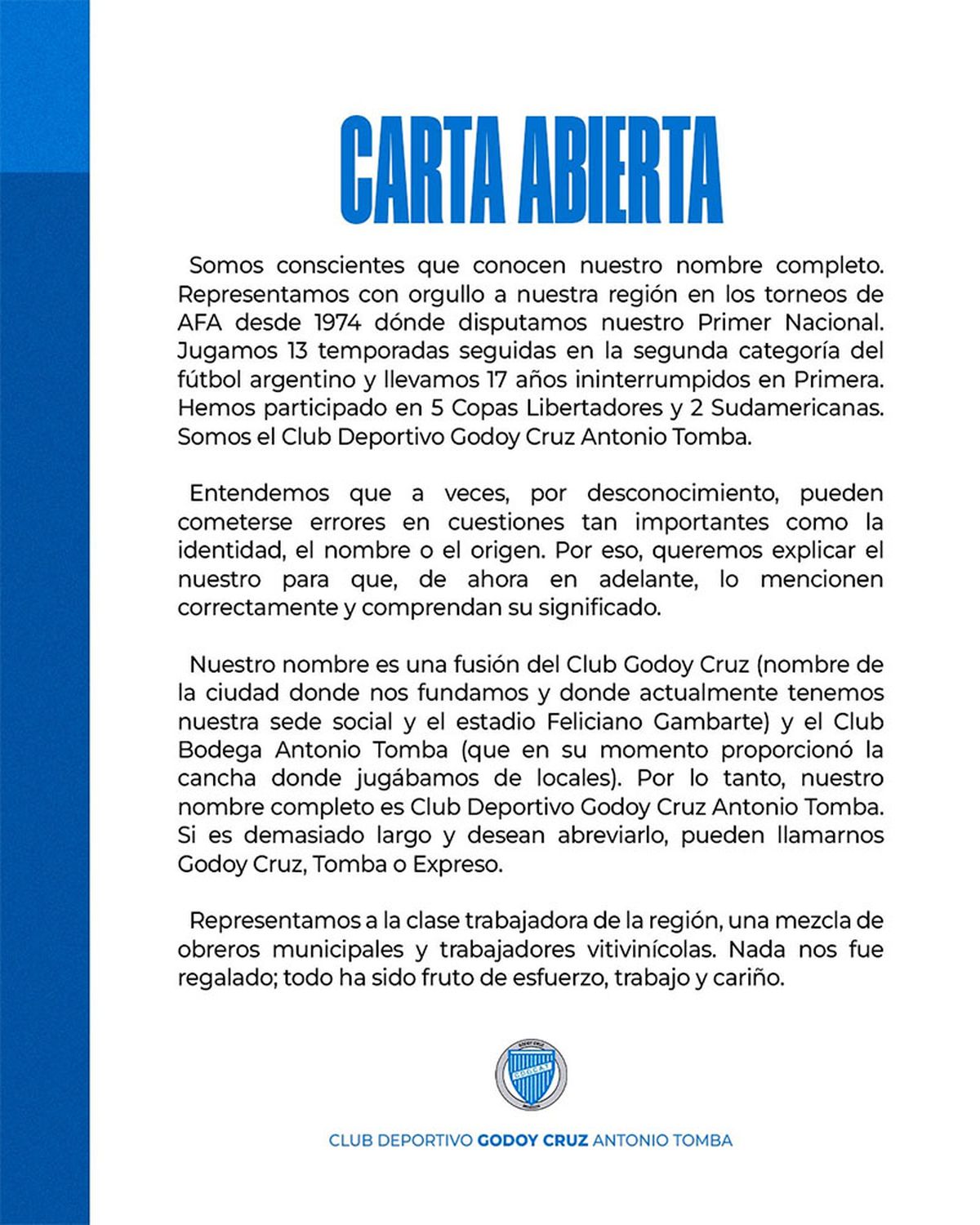 Somos conscientes que conocen nuestro nombre completo. Representamos con orgullo a nuestra región en los torneos de AFA desde 1974 dónde disputamos nuestro Primer Nacional. Jugamos 13 temporadas seguidas en la segunda categoría del fútbol argentino y llevamos 17 años ininterrumpidos en Primera. Hemos participado en 5 Copas Libertadores y 2 Sudamericanas. Somos el Club Deportivo Godoy Cruz Antonio Tomba.