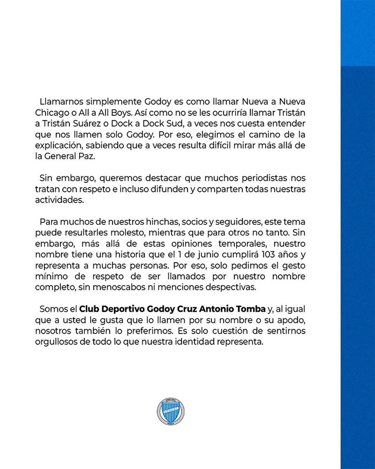 Para muchos de nuestros hinchas, socios y seguidores, este tema puede resultarles molesto, mientras que para otros no tanto. Sin embargo, más allá de estas opiniones temporales, nuestro nombre tiene una historia que el 1 de junio cumplirá 103 años y representa a muchas personas. Por eso, solo pedimos el gesto mínimo de respeto de ser llamados por nuestro nombre completo, sin menoscabos ni menciones despectivas.