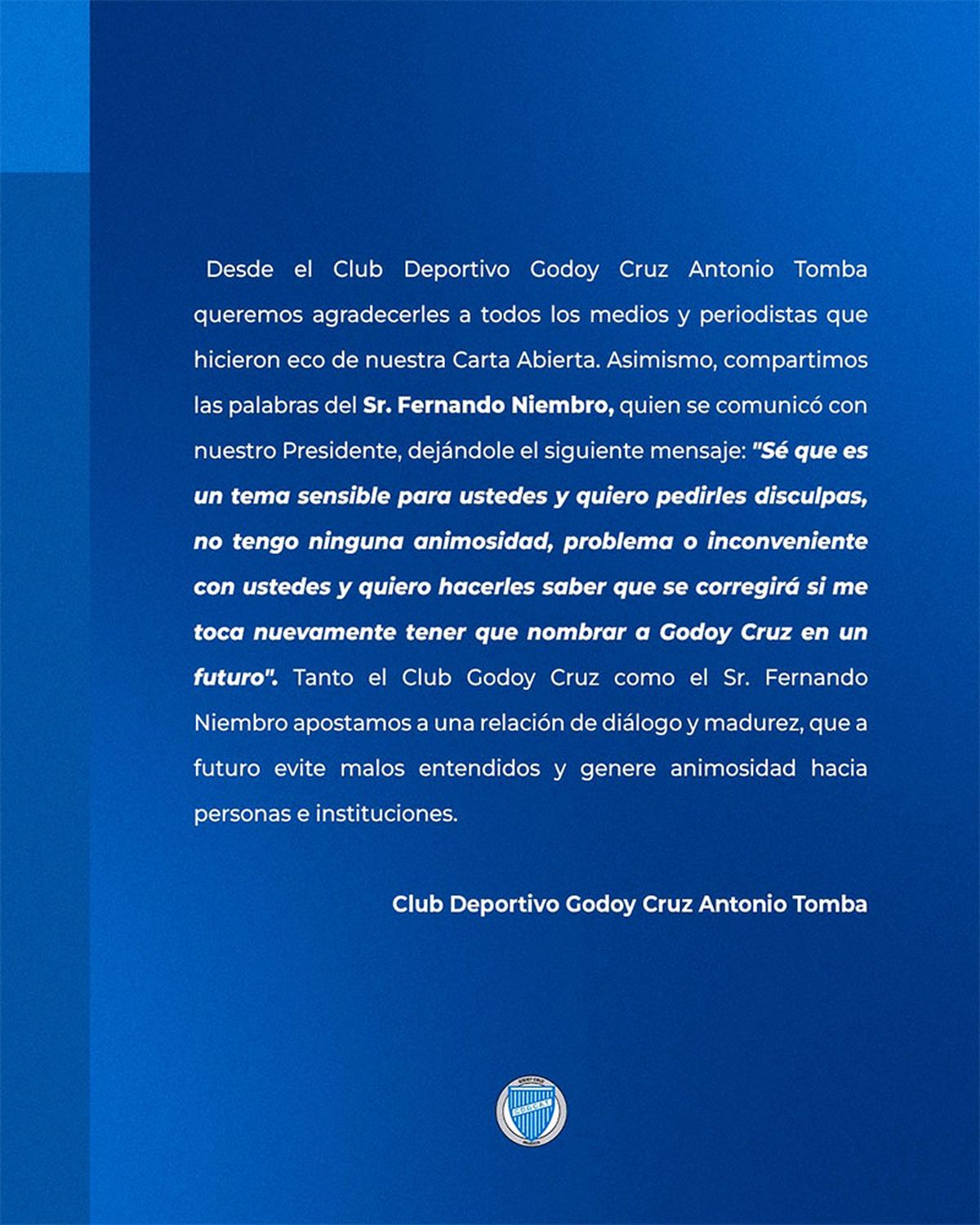 Mientras que la entidad tombina publicó este lunes otra carta, donde dijo: "Compartimos las palabras del señor Fernando Niembro, quien se comunicó con nuestro presidente y le dejó el siguiente mensaje: "Sé que es un tema sensible para ustedes y quiero pedirles disculpas, no tengo ninguna animosidad, problema, o inconveniente con ustedes y quiero decirles que se corregirá si me toca tener que nombrar a Godoy Cruz en un futuro".
