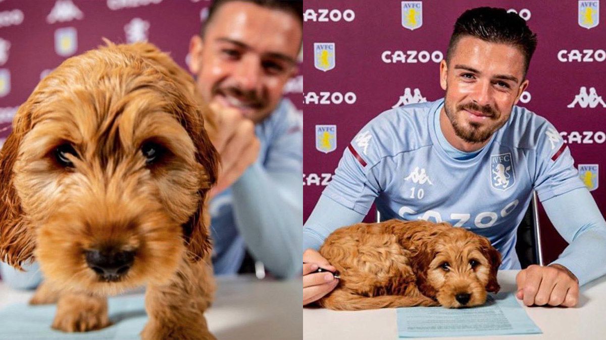 El delantero del Aston Villa, Jack Grealish firmó su extensión de contrato con el conjunto de la Premier League de una manera bastante curiosa, siendo acompañado por su mascota.