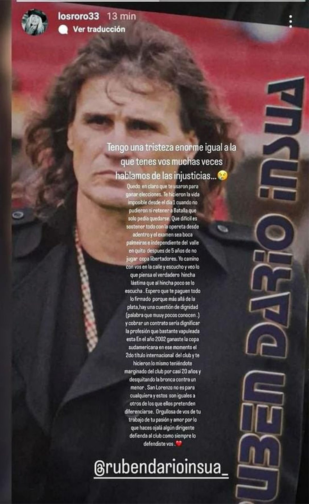 Además, la esposa del entrenador destacó lo hecho por Insua en el pasado: “En el año 2002 ganaste la Copa Sudamericana, en ese momento el segundo título internacional del club, y te hicieron lo mismo teniéndote marginado por casi 20 años y desquitando la bronca con un menor”.