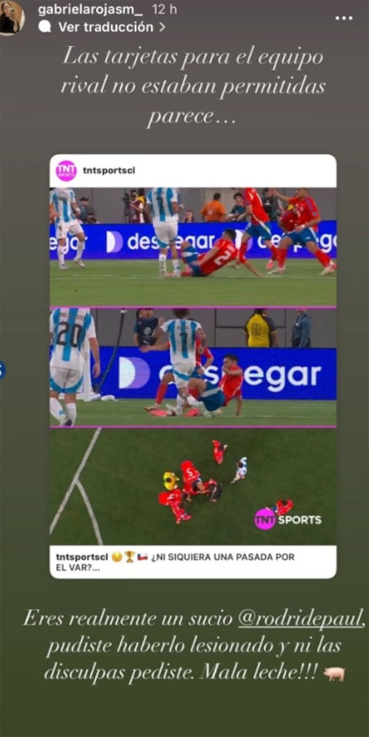 Con un enérgico mensaje en su cuenta de Instagram, la esposa de Suazo no dudó en calificar a De Paul de "sucio" debido a una entrada brusca que este último realizó contra su marido. "Las tarjetas para el equipo rival no estaban permitidas parece… Eres realmente un sucio @rodridepaul. Pudiste haberlo lesionado y ni las disculpas pediste. Mala leche", escribió Gabriela Rojas en donde subrayó su indignación por lo que consideró una falta de fair play.