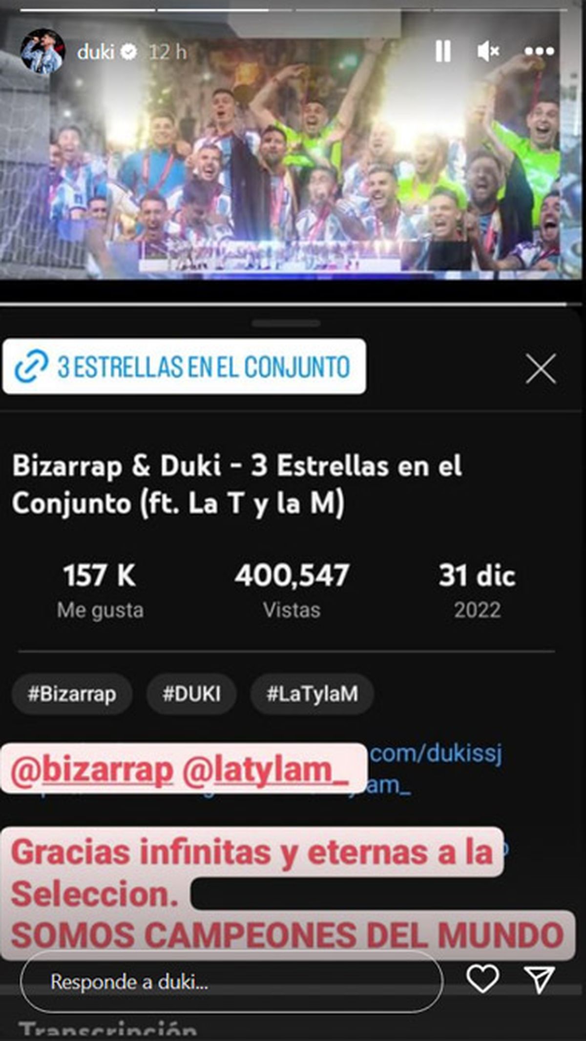 "Gracias infinitas y eternas a la Selección. Somos campeones del mundo", escribió Duki en sus historias de Instagram para anunciar el lanzamiento de esta canción con Bizarrap que hizo público el tema en sus redes deseando "Feliz fin de año" y agregando "Tengo las tres estrellas en el conjunto".