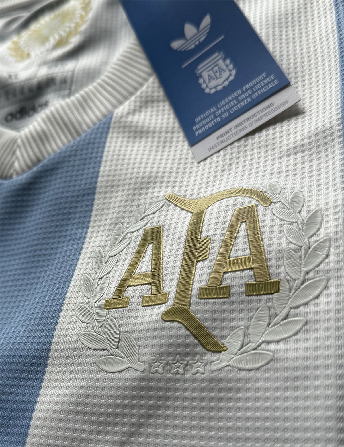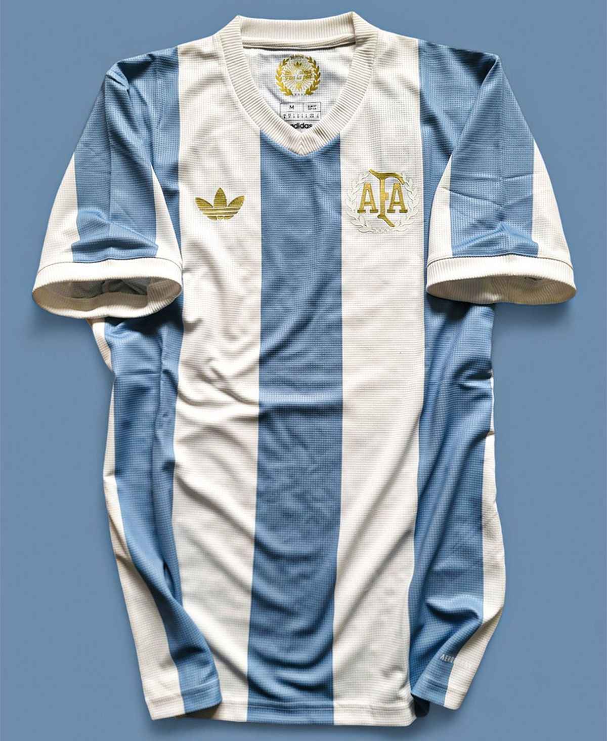 El diseño de la camiseta mantiene los tradicionales bastones celestes y blancos, pero esta vez con un toque vintage que le aporta un aire nostálgico y logos en dorado, un detalle que resalta el vínculo histórico con la marca.