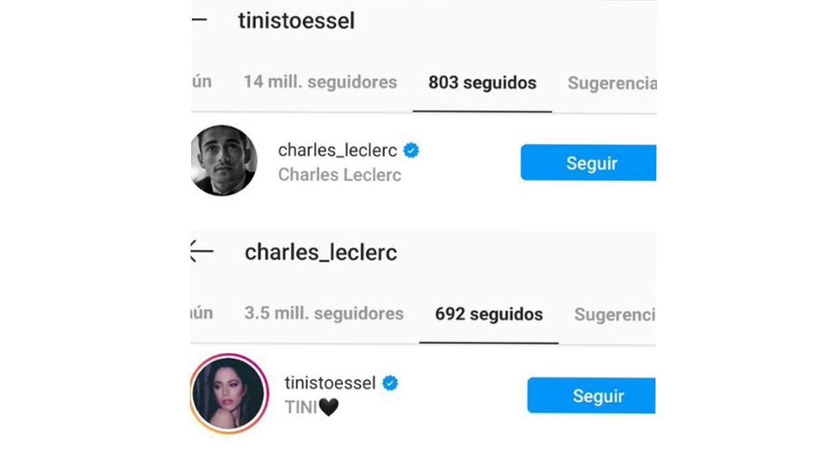 La noticia la dio a conocer el periodista deportivo Francisco Aure en su cuenta de Twitter, que publicó cómo la cantante y el piloto de Ferrari se siguen mutuamente en Instagram. Allí él tiene 14 millones de seguidores y sigue a solo 803 personas, una de ellas Tini. Por su parte ella tiene 3.5 millones de seguidores y sigue a 692, uno de ellos Charles.