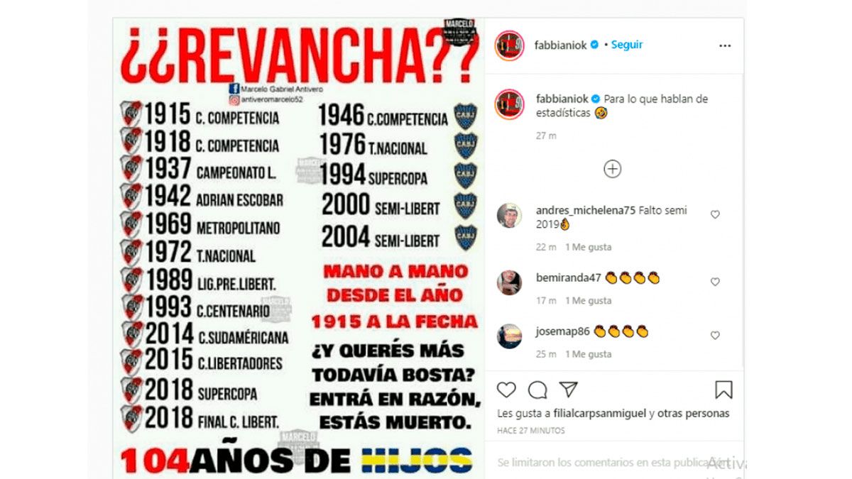 Y, al parecer en caliente, siguió con las chicanas: subió una placa con un repaso de distintos enfrentamientos entre ambos equipos desde 1915 hasta el 2018 titulado bien grande. A lo que escribió: "¿Revancha?", e inmediatamente agregó: "Para los que hablan de estadísticas".