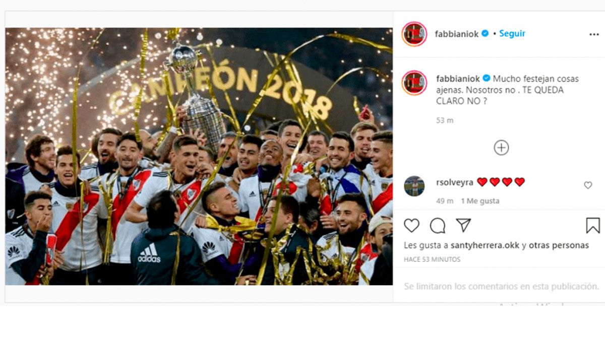 La primera publicación, en su cuenta de Instagram (@fabbianiok), fue de una foto de River levantando la Copa Libertadores 2018, que le ganó a Boca en Madrid, y el mensaje fue: "Muchos festejan cosas ajenas. Nosotros no. TE QUEDA CLARO, ¿NO?".