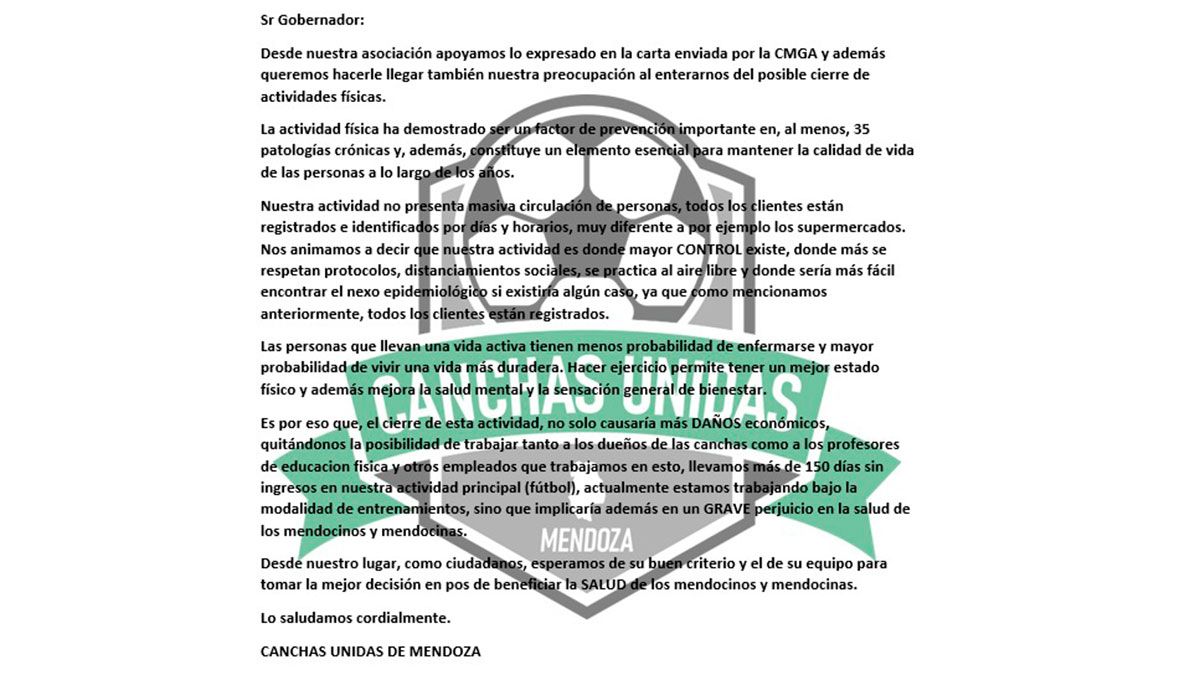 La Asociación Canchas Unidas de Mendoza venían desde hace tiempo luchando por la apertura de la actividad bajo un estricto protocolo con el objetivo de sacar de las calles el fútbol clandestino.