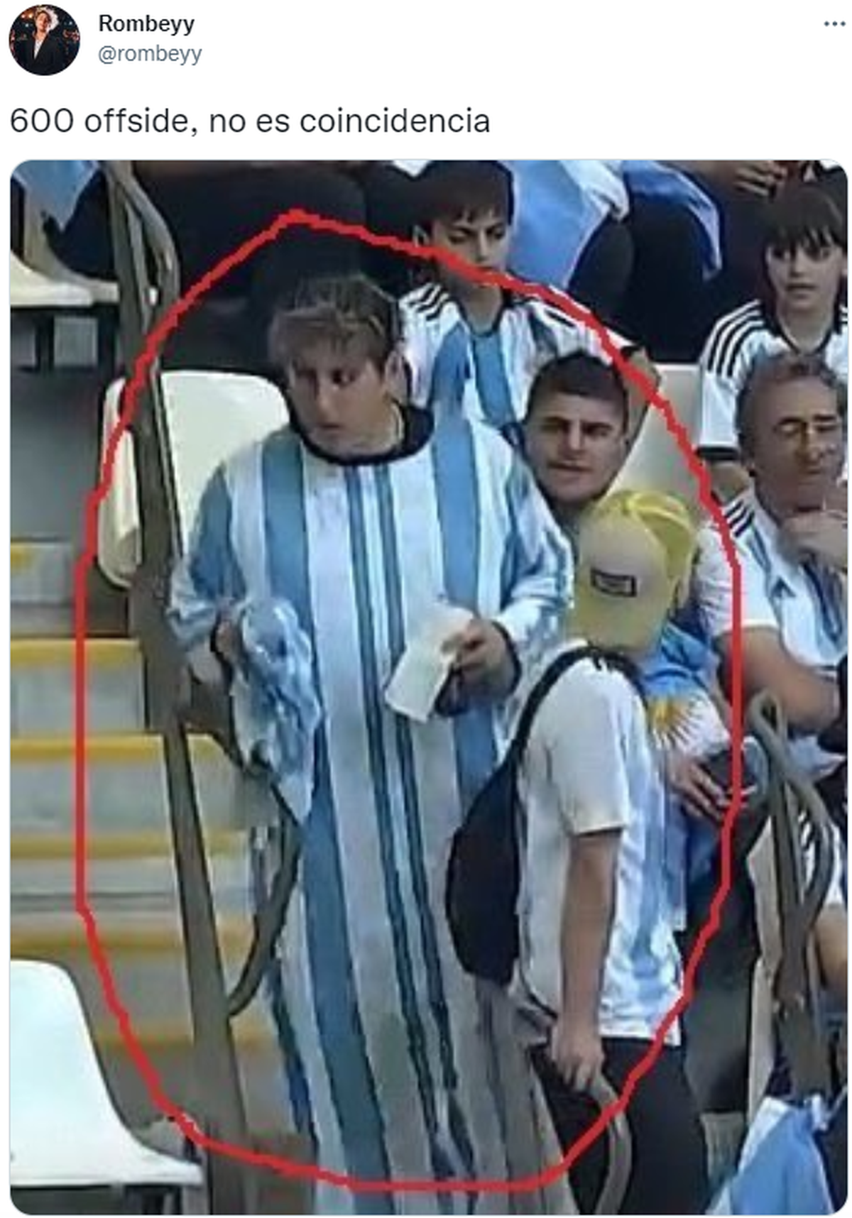 La foto del chico en el estadio donde la Selección Argentina debutó en el Mundial Qatar 2022 fue viralizada por el usuario de la red del pajarito azul Rombeyy, y el chiste llegó a conseguir más de 50 mil me gusta en cuestión de minutos: "600 offside, no es coincidencia". Lejos de salir a defender al Chapu Martínez, el resto de los perfiles de Twitter se sumaron a la campaña de encontrar un culpable.