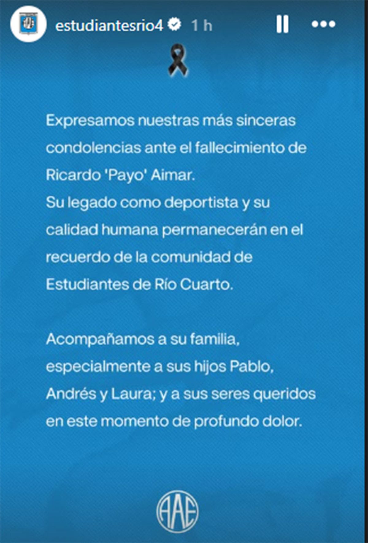"Expresamos nuestras más sinceras condolencias ante el fallecimiento de Ricardo ‘Payo’ Aimar. Su legado como deportista y su calidad humana permanecerán en el recuerdo de la comunidad de Estudiantes de Río Cuarto. Acompañamos a su familia, especialmente a sus hijos Pablo, Andrés y Laura; y a sus seres queridos en este momento de profundo dolor", afirmó Estudiantes en Instagram.