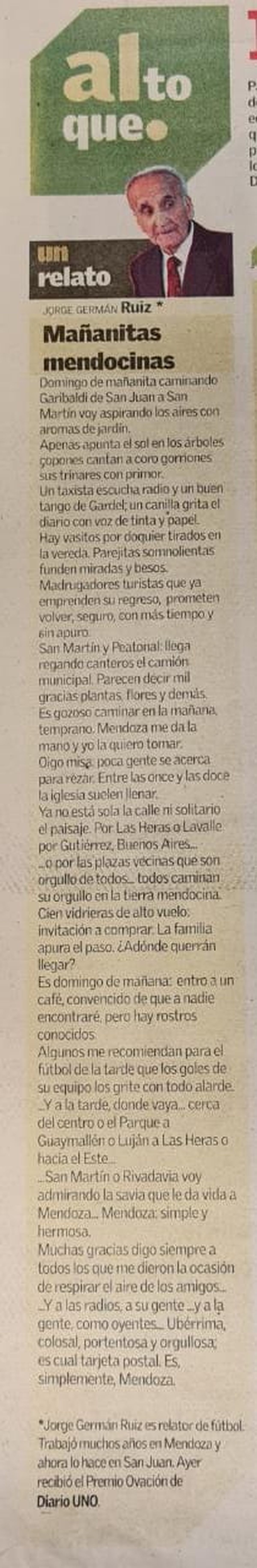 En 2008, Jorge Germán Ruiz recibió el Premio UNO a la trayectoria y escribió una columna en las páginas de Ovación titulada Mañanitas Mendocinas.