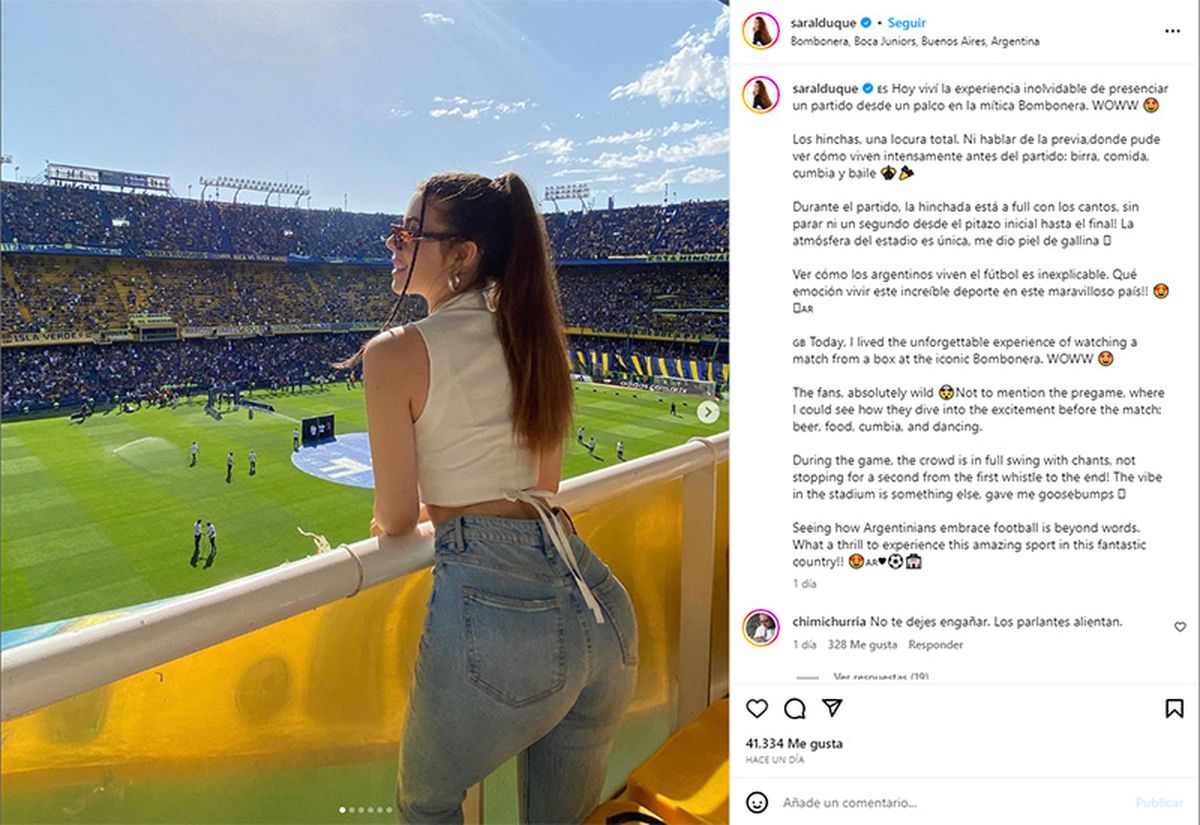 “Hoy viví la experiencia inolvidable de presenciar un partido desde un palco en la mítica Bombonera. Los hinchas son una locura total. Ni hablar de la previa, donde pude ver cómo viven intensamente antes del partido: birra, comida, cumbia y baile”, escribió Duque en sus redes sociales.