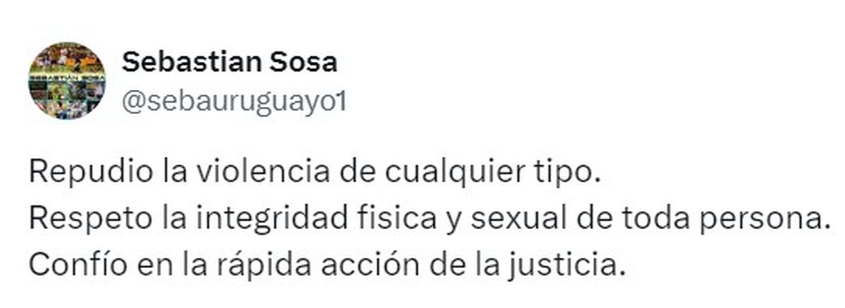 "Repudio la violencia de cualquier tipo, respeto la integridad física y sexual de toda persona; confío en la justicia", escribió el jugador en su cuenta X, donde se mostró totalmente en contra de cualquier tipo de abuso o violencia sexual. A su vez, pidió por la rápida acción de la Justicia ante esta denuncia en su contra.