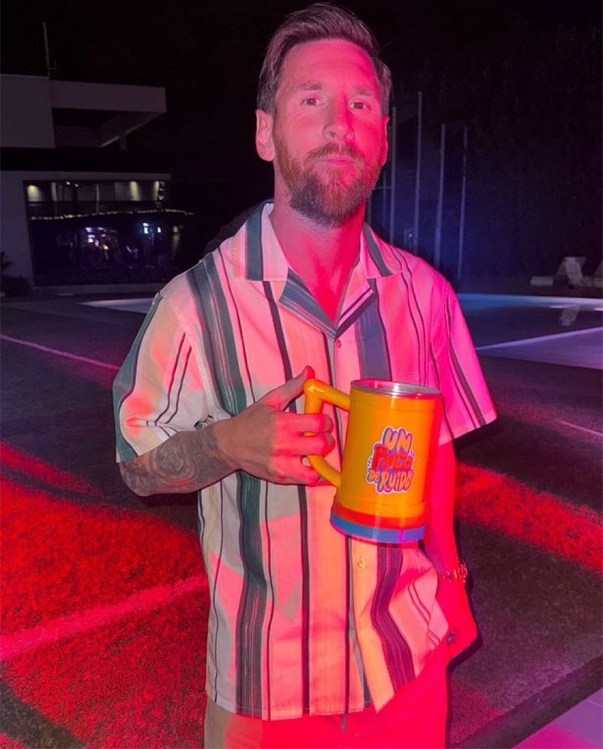 Más adelante, Roccuzzo subió una graciosa historia de Messi con una jarra personalizada del programa de cumbia “Un Poco de Ruido” en la que se lo ve con cara de serio y la mano izquierda en uno de los bolsillos del pantalón.