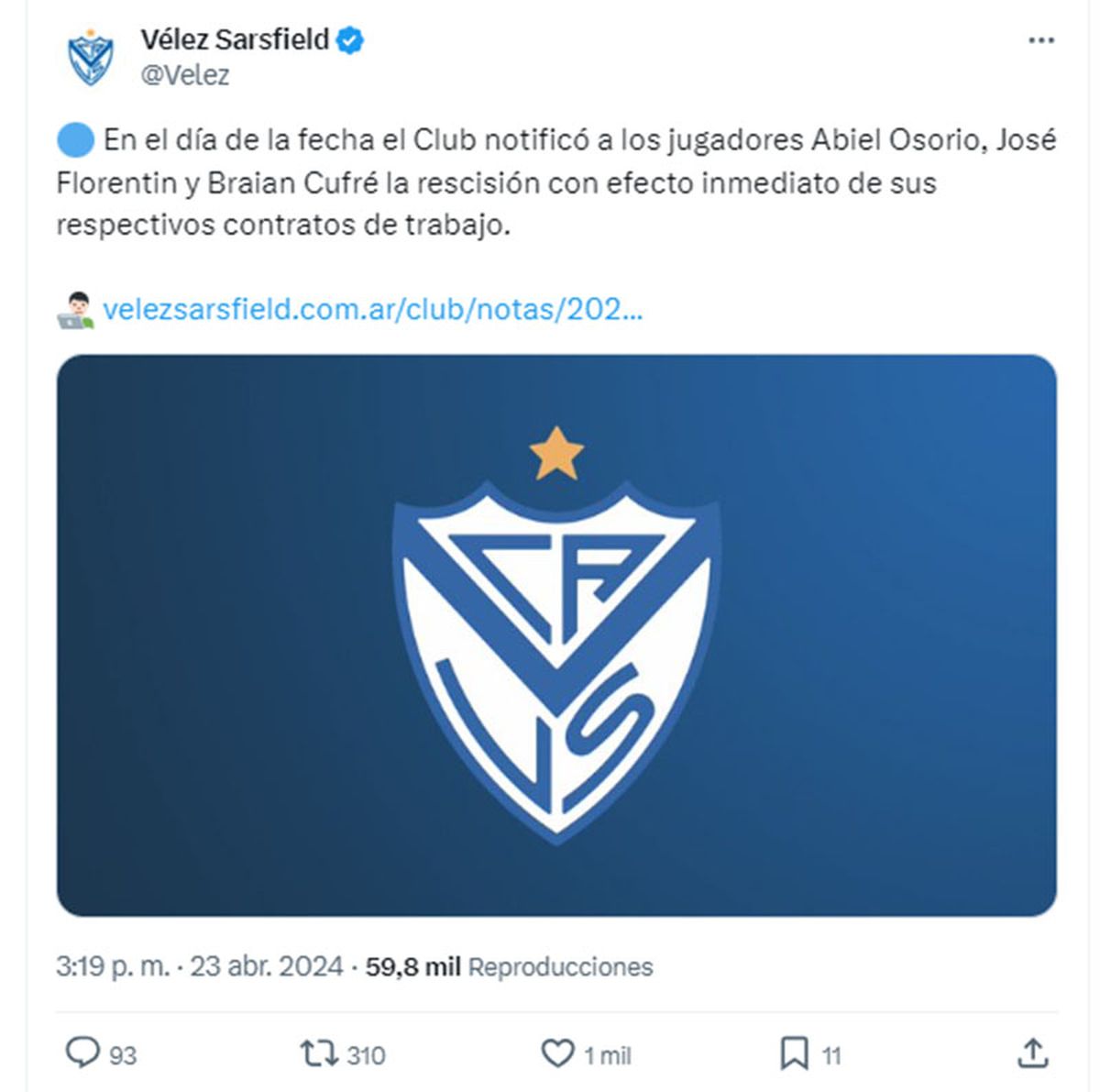 Vélez confirmó este martes que notificó a Abiel Osorio, José Florentín y Braian Cufré acerca de la rescisión de sus contratos, luego del escándalo de abuso sexual en los que están implicados ellos tres junto con el arquero Sebastián Sosa, también desafectado del club días atrás.