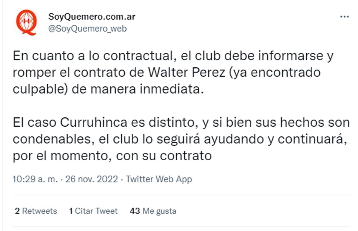El jugador "Quemero", de 24 años, había estado ocho meses preso y en septiembre de 2020 fue excarcelado ya que la Cámara de Acusación de Córdoba revocó su prisión preventiva por falta de mérito.