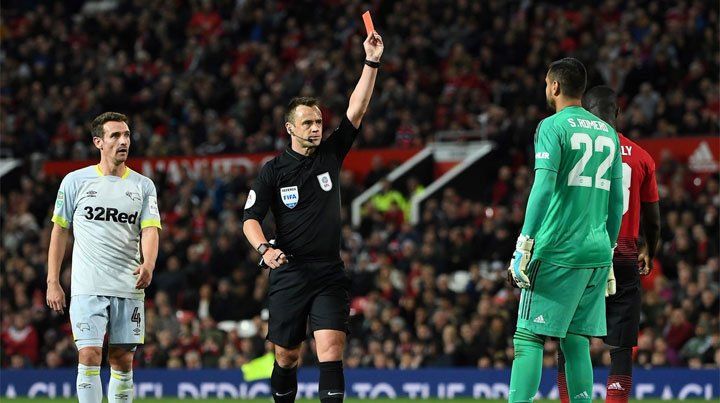 En su regreso a la titularidad en el arco del Manchester United, Sergio Romero se fue expulsado por un grosero error y para males su equipo quedó eliminado en la tercera ronda de la Copa de la Liga inglesa frente al Derby County.