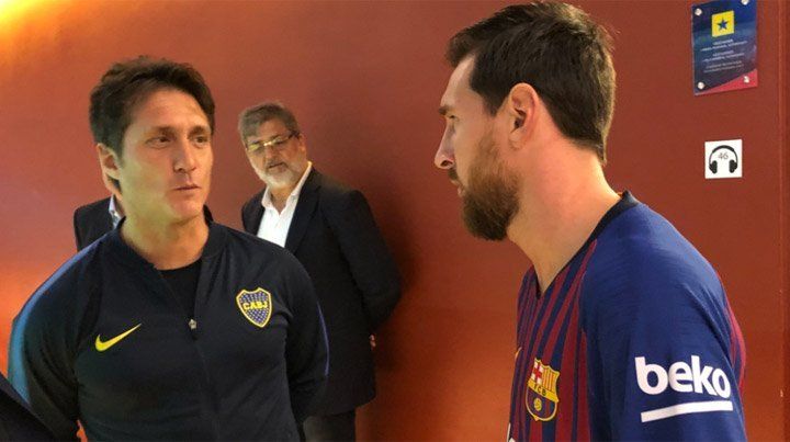 Lionel Messi, del Barcelona, se acercó a saludar al vestuario visitante y conversó unos minutos con el entrenador Guillermo Barros Schelotto, de Boca.