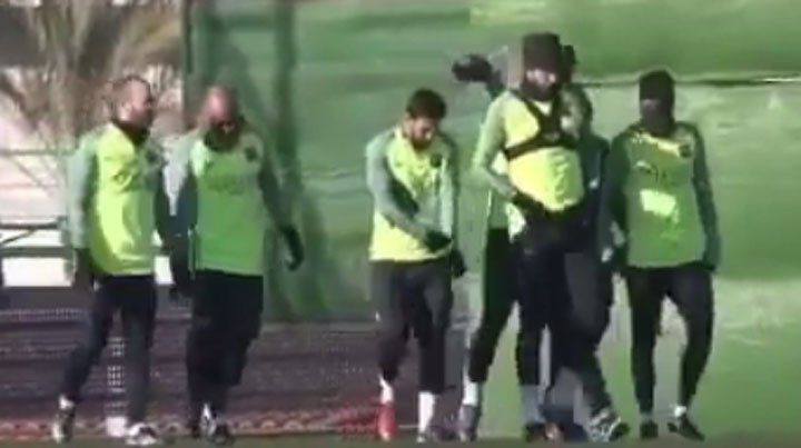 Durante el entrenamiento del Barcelona, el brasilero y el uruguayo tomaron de punto al central catalán y lo terminaron derribando.