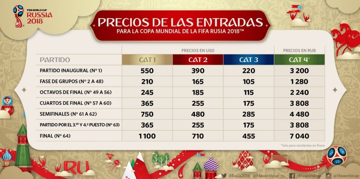 Los residentes en Rusia tendrán fuertes descuentos: las entradas más baratas costarán 1.280 rublos (20 dólares), un aumento con respecto a los precios equivalentes en 2014 pero casi iguales a los que pagaron los aficionados sudafricanos en 2010.