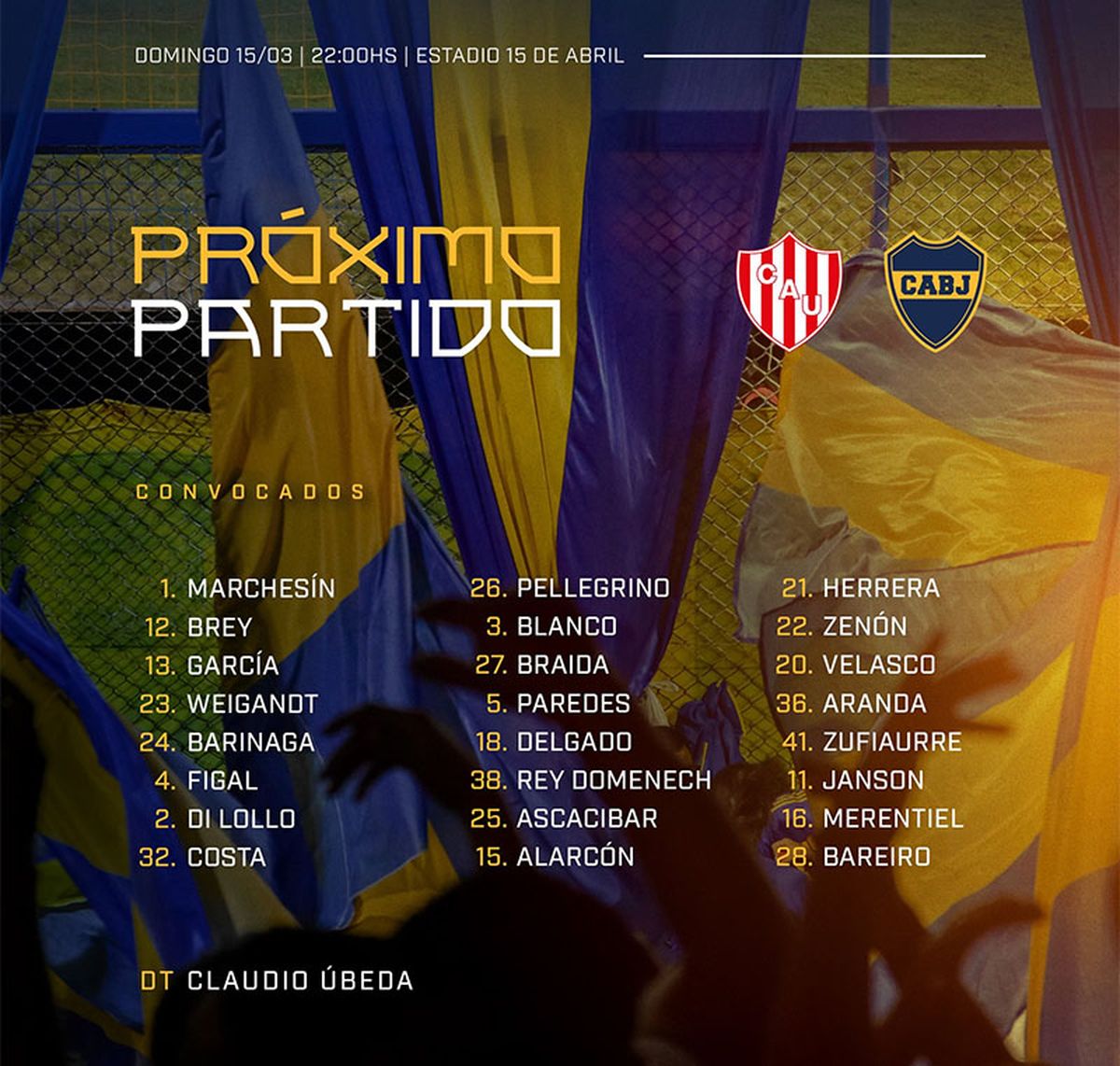 Boca: Agustín Marchesín; Juan Barinaga o Marcelo Weigandt, Lautaro Di Lollo o Nicolás Figal, Ayrton Costa, Lautaro Blanco; Leandro Paredes, Milton Delgado, Santiago Ascacíbar, Tomás Aranda; Miguel Merentiel y Adam Bareiro. DT: Claudio Úbeda.