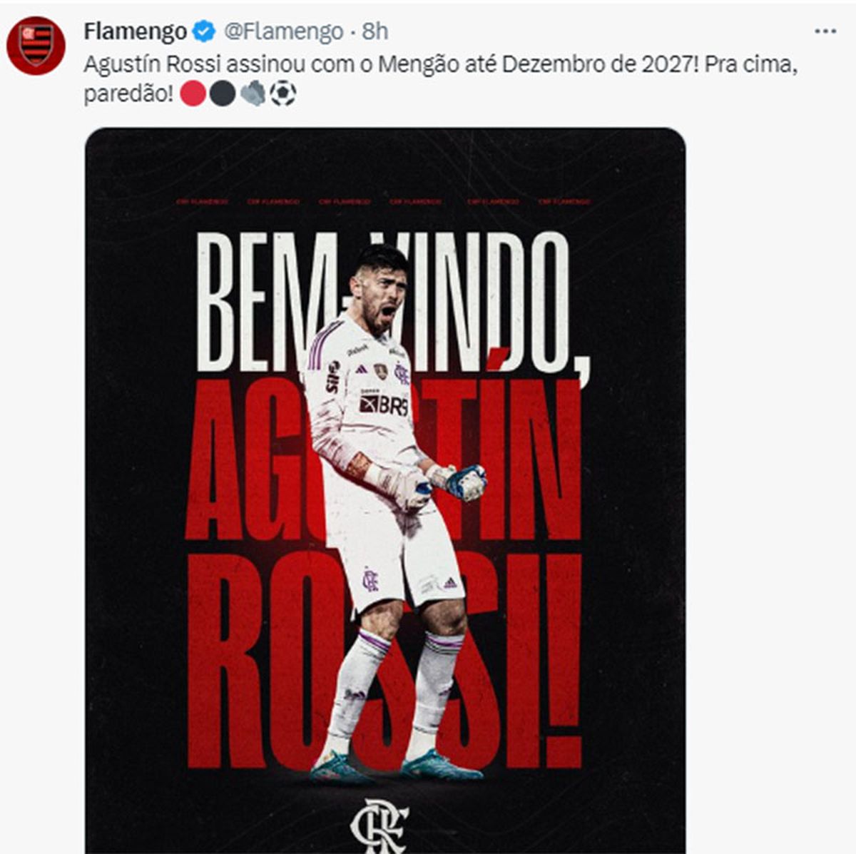 "Bienvenido, Agustín Rossi", se puede leer en la cuenta oficial del "Mengao", que comunicó que el arquero firmará contrato hasta diciembre de 2027. "Arriba, Pared", cerró el mensaje.