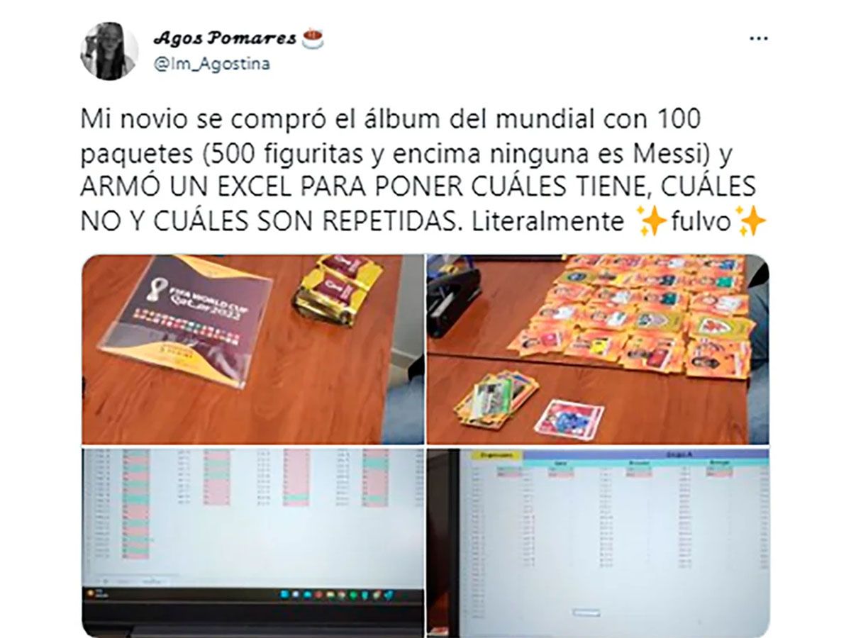 “Mi novio se compró el álbum del mundial con 100 paquetes (500 figuritas y encima ninguna es Messi) y ARMÓ UN EXCEL PARA PONER CUÁLES TIENE, CUÁLES NO Y CUÁLES SON REPETIDAS. Literalmente fulvo", posteó una joven en Twitter. El posteo fue siendo respondido por otros coleccionsitas que terminaron armando un grupo en Telegram llamado “Tradeo figus Qatar 2022”.