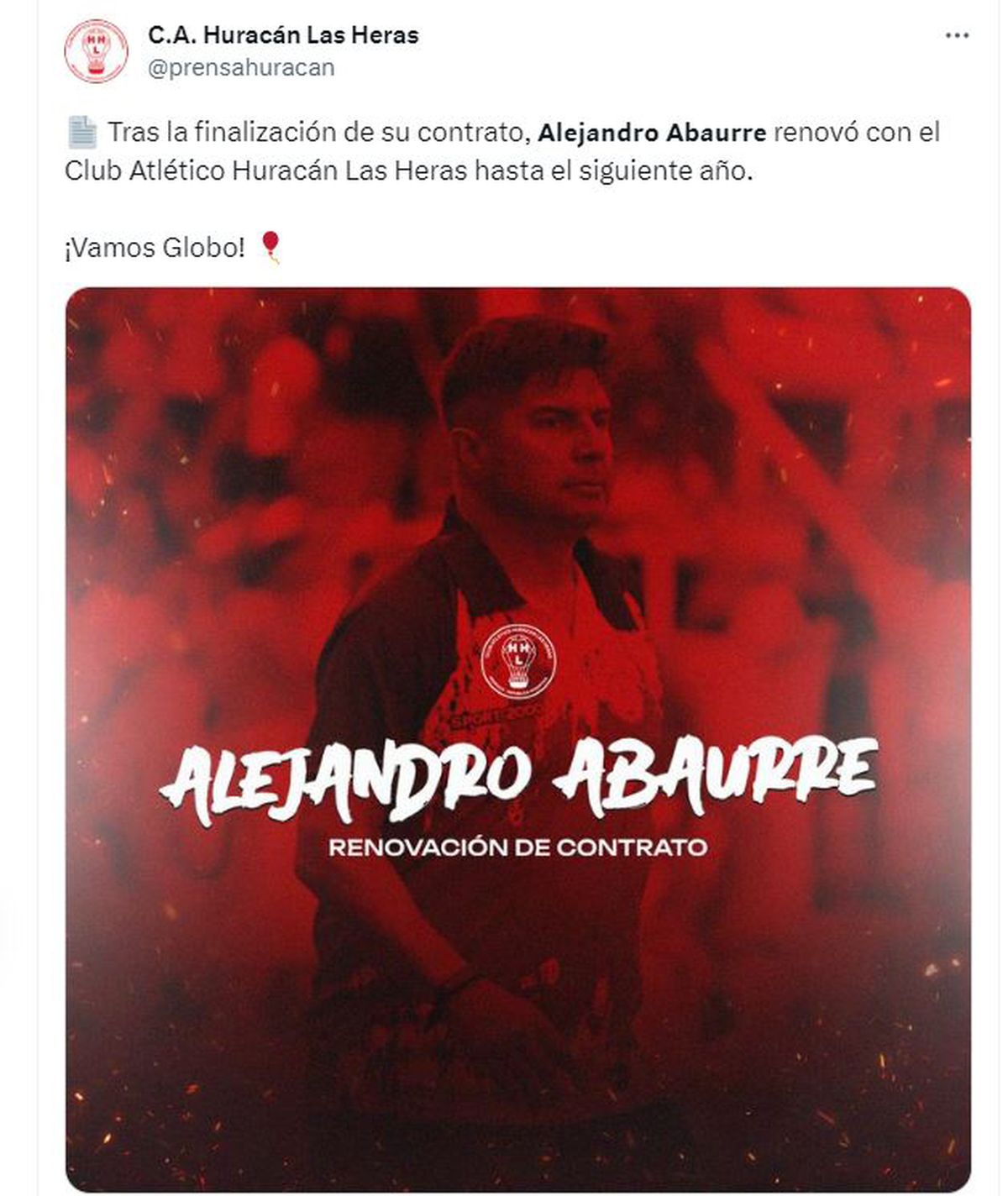 Huracán Las Heras confirmó este jueves en sus redes sociales que el entrenador Alejandro Abaurre renovó su contrato por un año con la institución de calle Olascoaga. El Cachorro finalizaba su contrato este viernes 30 de junio y desde el club anunciaron la prolongación del vínculo. Será su tercera etapa en el club, ya que estuvo en la temporada 2018/19 y luego volvió en el 2022.