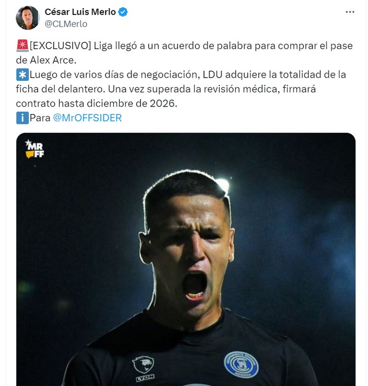 "Después de varias negociaciones pudimos llegar a un acuerdo entre los clubes. Liga de Quito compra el 100% de su pase. Ellos pagaron la cláusula de rescisión", expresó Miguel Gareppe, representante de Arce, en ABC Cardinal 730 AM.