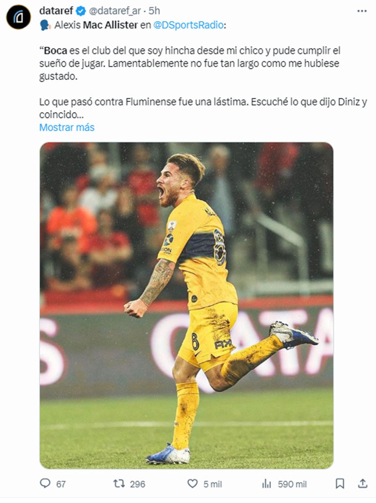 El volante del Liverpool y de la Selección argentina Alexis Mac Allister opinó sobre la final de la Copa Libertadores en la que Boca fue derrotado. El mediocampista jugó y es hincha confeso del Xeneize.