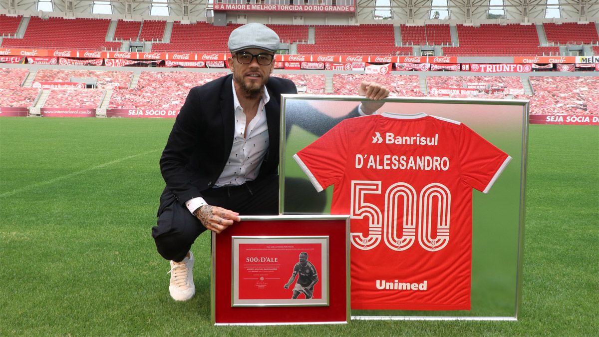 El mediocampista argentino Andrés D’Alessandro fue homenajeado en el estadio Beira Río por alcanzar la marca de los 500 partidos en el Inter de Porto Alegre.