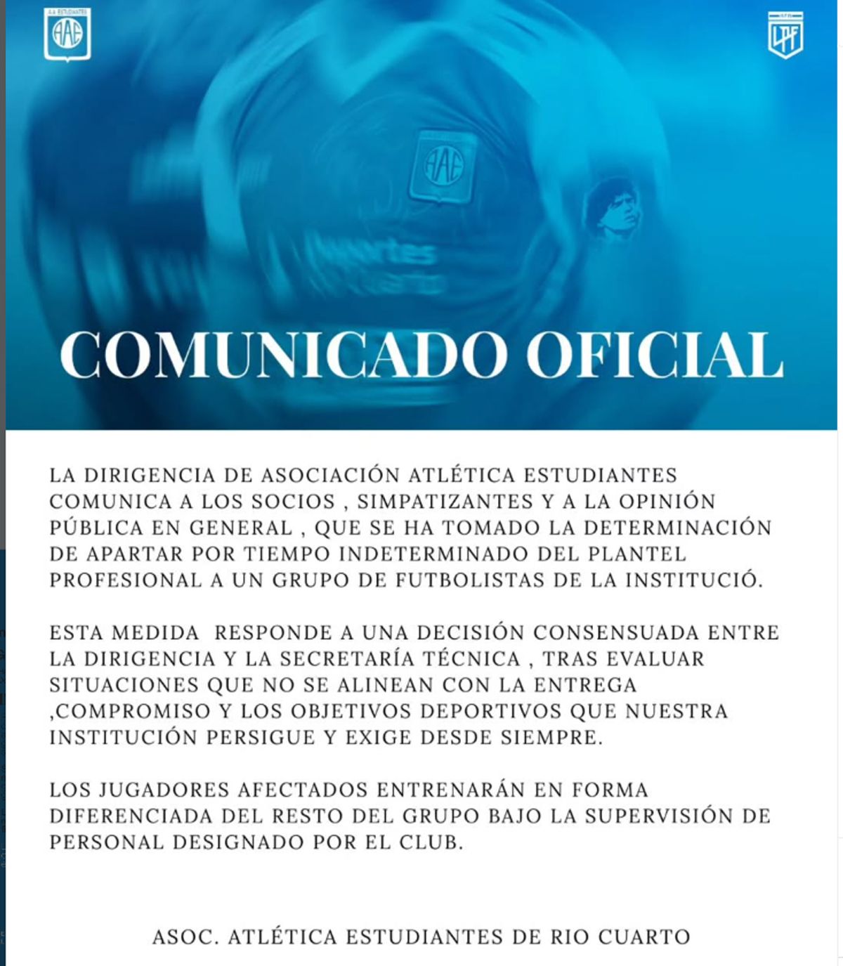 La dirigencia de Asociación Atlética Estudiantes, a través de sus redes sociales, comunicó "a los socios, simpatizantes y a la opinión pública en general, que se ha tomado la determinación de apartar por tiempo indeterminado del plantel profesional a un grupo de futbolistas de la institución".