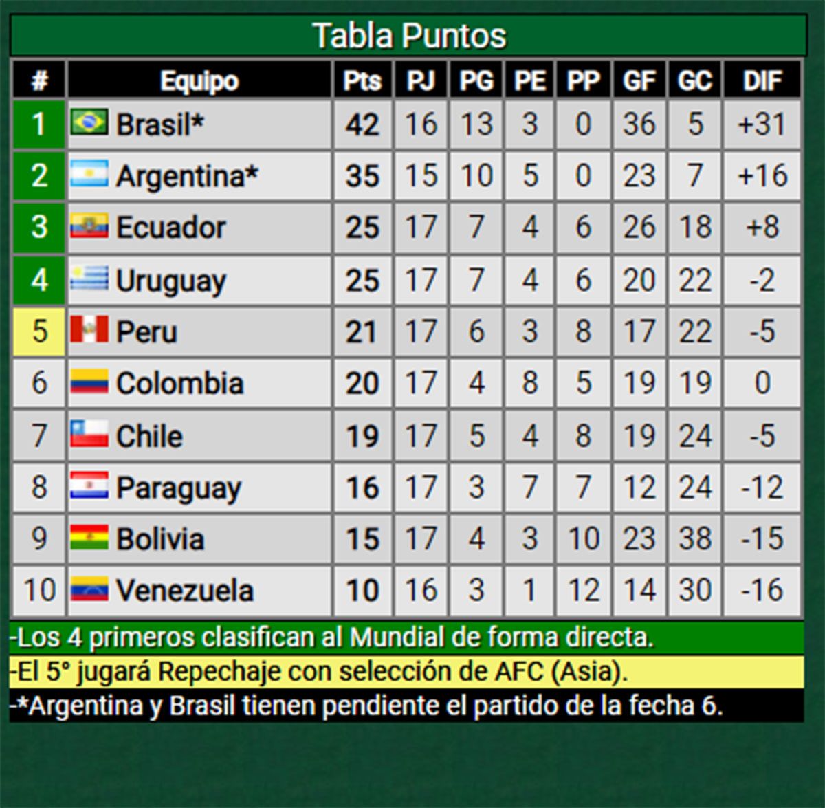En la última fecha Chile recibe a Uruguay, donde necesita ganar y que tanto Perú como Colombia no ganen sus encuentros.