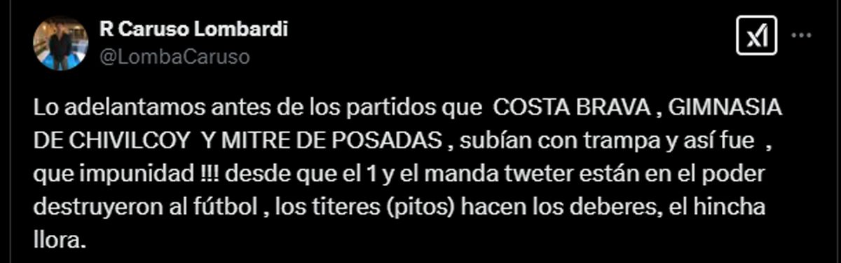 "Lo adelantamos antes de los partidos que COSTA BRAVA, GIMNASIA DE CHIVILCOY Y MITRE DE POSADAS, subían con trampa y así fue, que impunidad !!! desde que el 1 y el manda tweter están en el poder destruyeron al fútbol, los títeres (pitos) hacen los deberes, el hincha llora", indicó el polémico y mediático DT en clara alusión al presidente de la AFA, Claudio Tapia, y a uno de sus colaboradores, Pablo Toviggino, muy activo en Twitter (X).