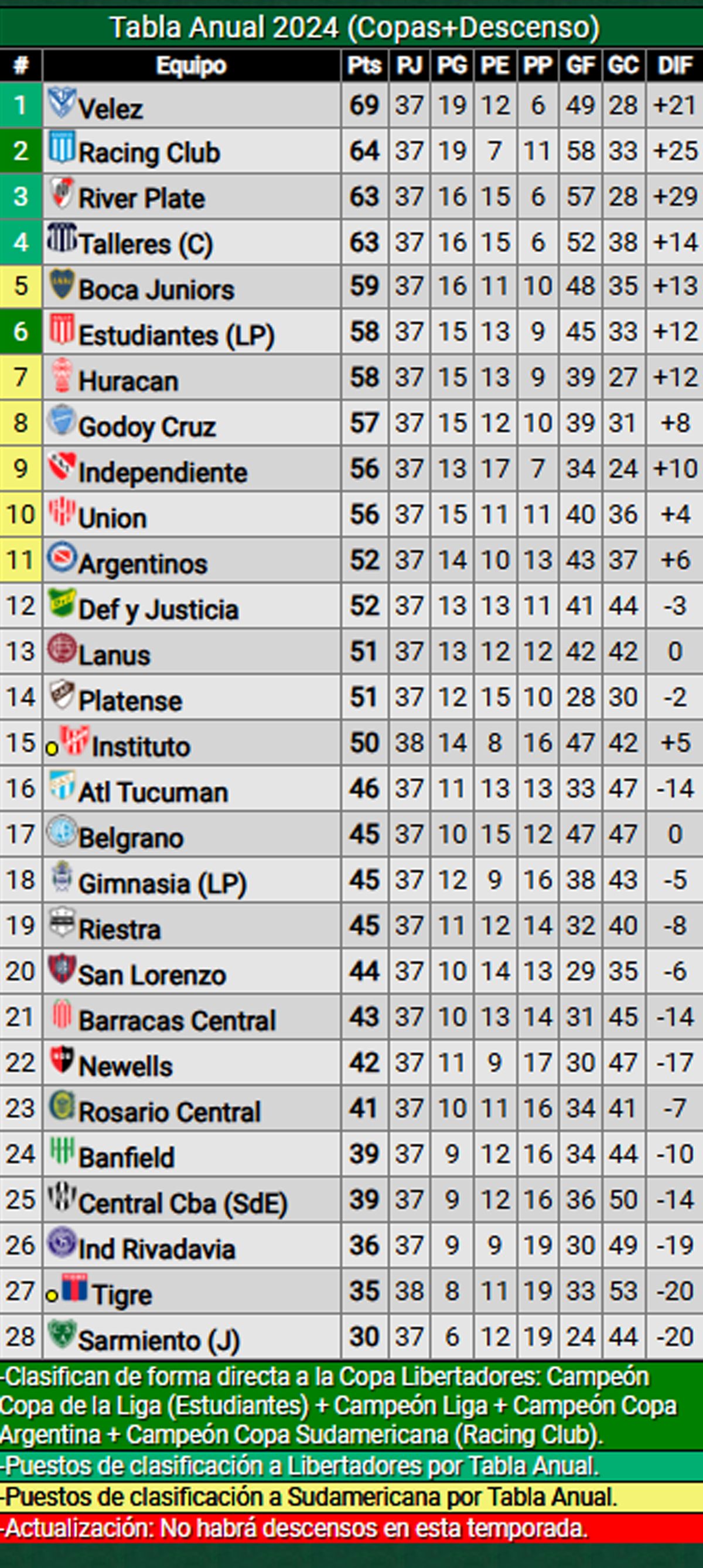 Finalmente, en la tabla anual Vélez lidera (69 puntos) Racing está segundo (64) pero ya no tiene su plaza, por lo que River y Talleres (ambos con 63) están en zona de clasificación, seguidos de cerca por Boca (59), Estudiantes (ya clasificado con 58), Huracán (58) y Godoy Cruz (57).