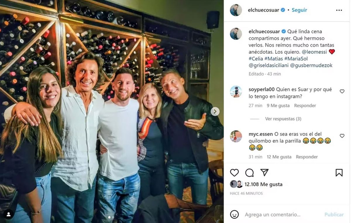 Lionel Messi, que no estuvo junto a Antonela Roccuzzo y sus hijos, Thiago, Mateo y Ciro, compartió un grato momento junto al Chueco Suar y su ex pareja Griselda Siciliani y su hija Margarita. Además estuvo el actor Gustavo Bermúdez y familiares del rosarino, como su mamá Celia y sus hermanos, Matías y Sol.