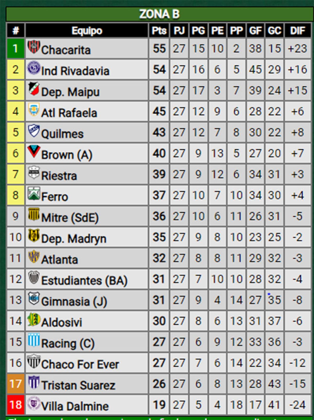 Con la victoria el Cruzado llegó a los 54 puntos al igual que Independiente Rivadavia, que este sábado superó por 2 a 1 a Gimnasia y Esgrima de Jujuy, en el estadio Bautista Gargantini. El líder sigue siendo Chacarita, que este sábado le ganó por 1 a 0 a Racing de Córdoba, de local.