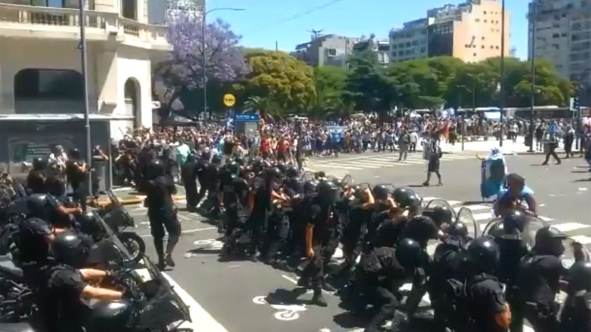 Luego de varios minutos de tensión en el cordón que había armado la policía sobre el ancho de la Avenida de Mayo, se registraron los primeros disturbios de la jornada del velatorio del astro futbolístico.