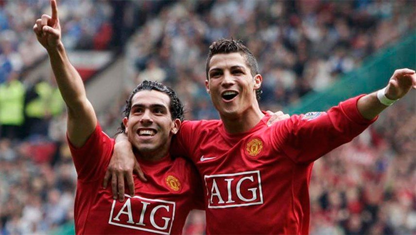 Tevez jugó dos temporadas en el Manchester United, entre el 2007 y el 2009, y ganó seis títulos: la Premier League en dos ocasiones, la Champions League en 2008, una Supercopa inglesa, una Copa de la Liga y el Mundial de Clubes.