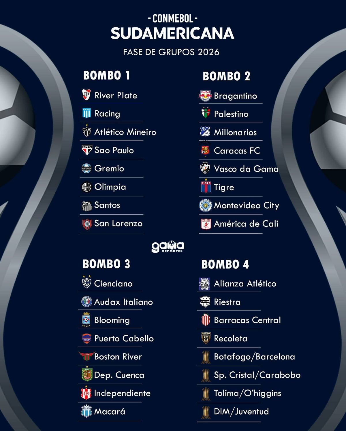 Con la disputa de la fase previa quedaron conformados los bombos para el sorteo de la Copa Sudamericana 2026 en la que River, Racing y San Lorenzo figuran entre los favoritos.