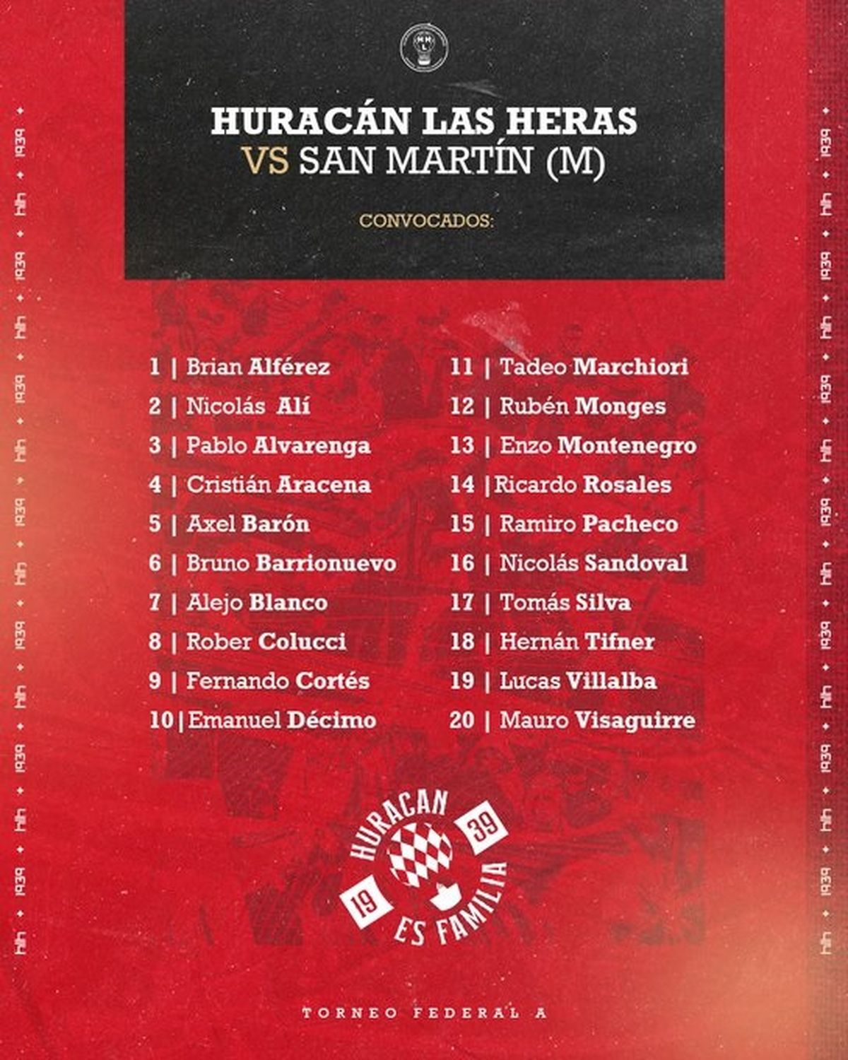 Huracán Las Heras en su última presentación igualó sin goles ante Argentino de Monte Maíz, de Córdoba, en el estadio General San Martín. El conjunto dirigido por Alejandro Abaurre ha sumado 7 puntos, ganó dos y empató un encuentro y buscará sumar los tres puntos para llegar a la cima de la tabla de posiciones, ya que se ubica a un punto del líder Juventud Unida.