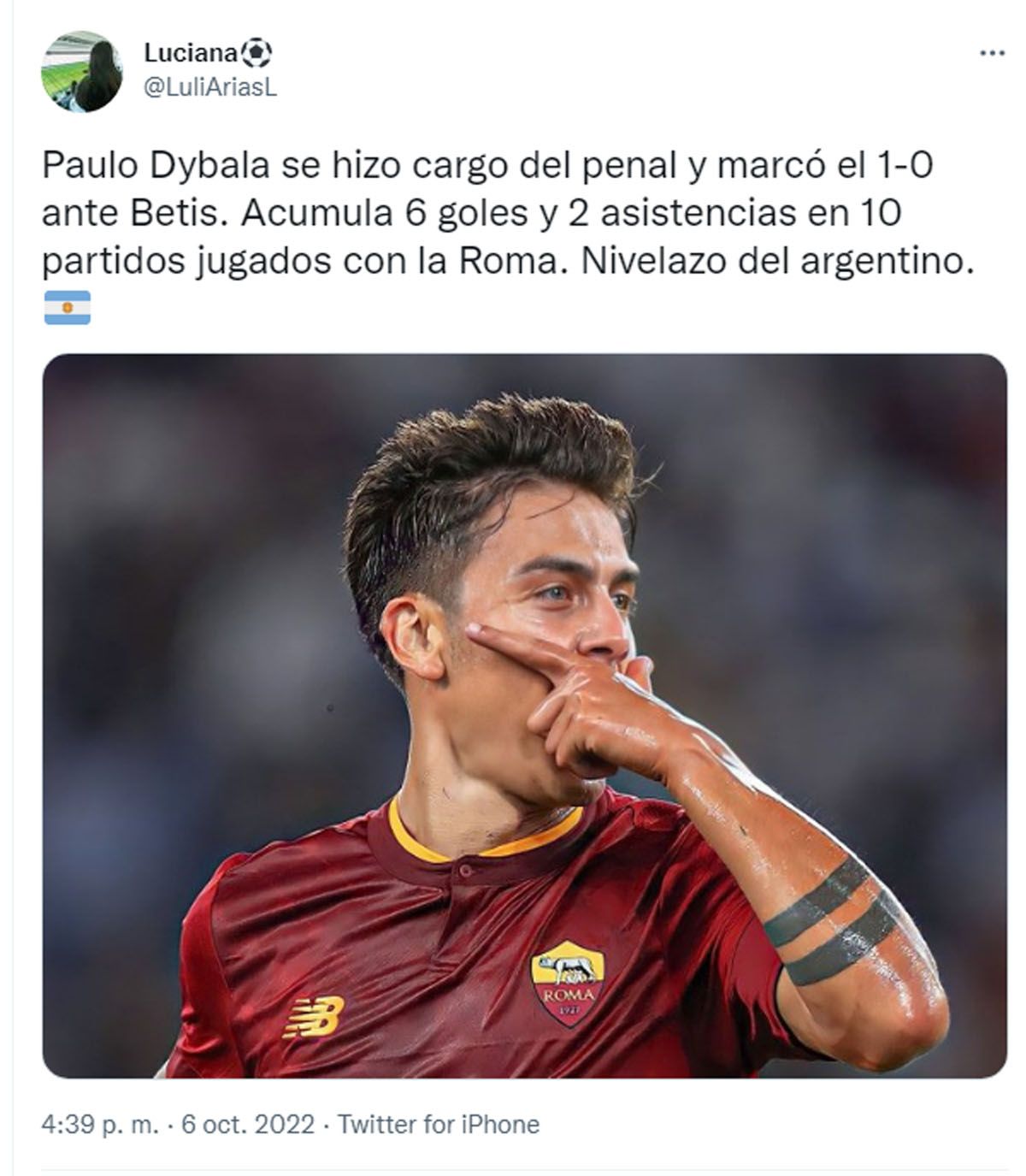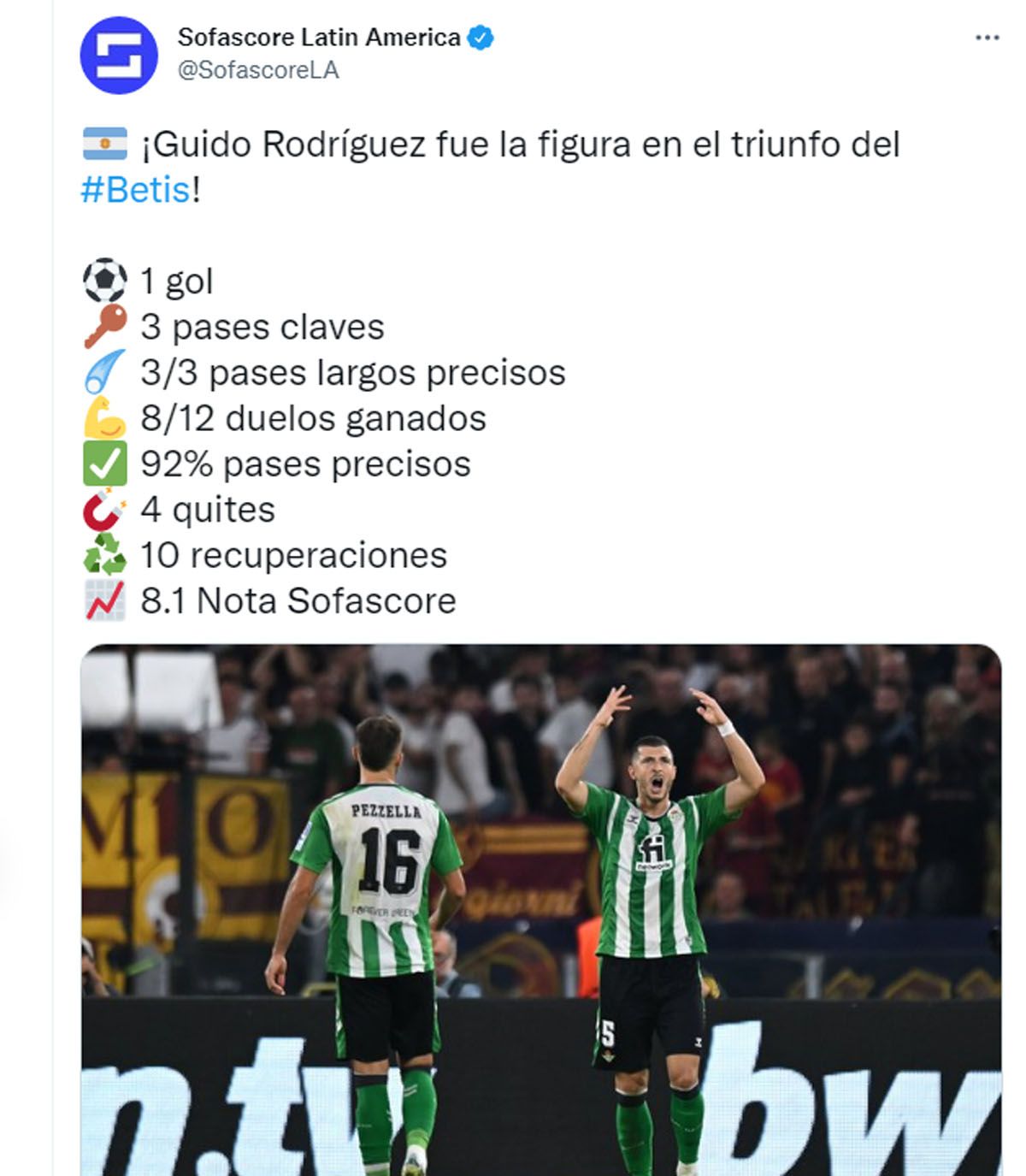 Betis, con un golazo de Guido Rodríguez, le ganó de visitante por 2 a 1 a Roma, que se había puesto en ventaja con un penal de Paulo Dybala, en partido de la tercera fecha del grupo C de la Europa League.