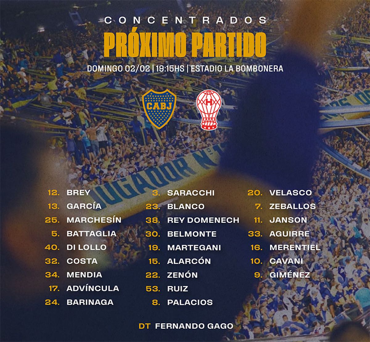 Boca: Leandro Brey o Agustín Marchesín; Luis Advíncula o Lucas Blondel, Rodrigo Battaglia, Ayrton Costa, Marcelo Saracchi; Williams Alarcón, Tomás Belmonte, Carlos Palacios, Alan Velasco; Exequiel Zeballos y Edinson Cavani. DT: Fernando Gago.