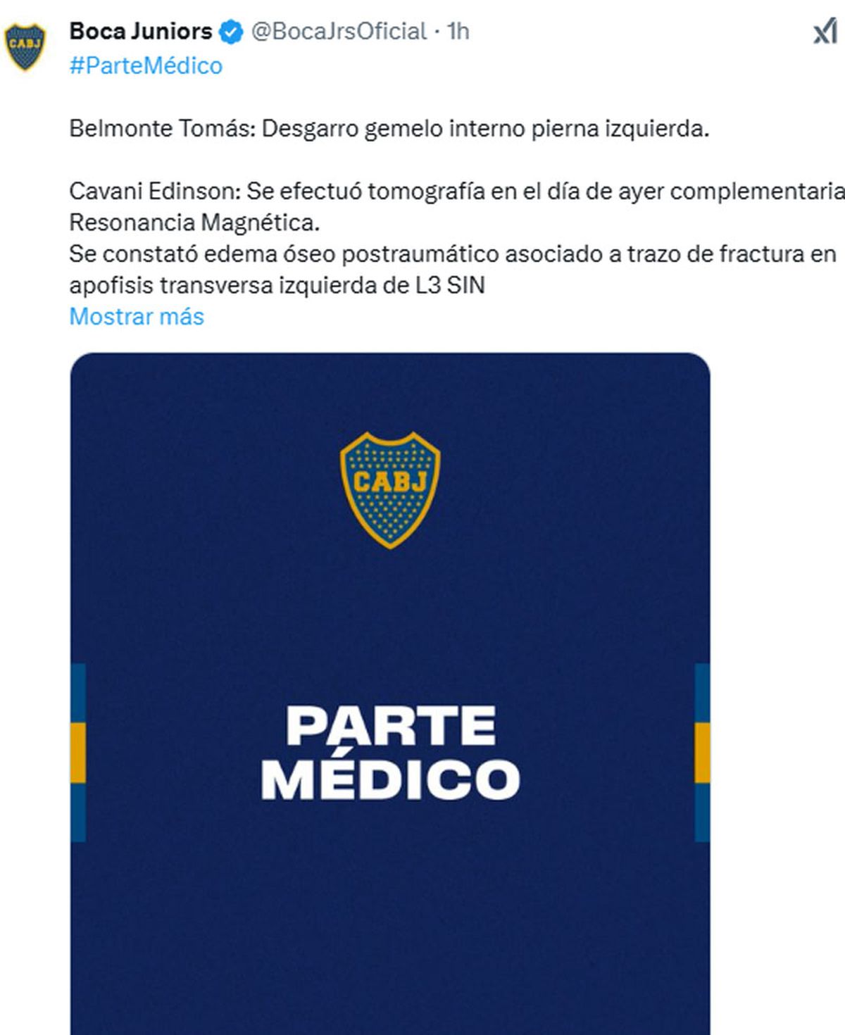 Boca Juniors dio a conocer el parte médico sobre su goleador, el uruguayo Edinson Cavani, quien no estuvo en el triunfo 2 a 0 sobre Independiente Rivadavia, por la cuarta fecha del Torneo Apertura por una lesión lumbar