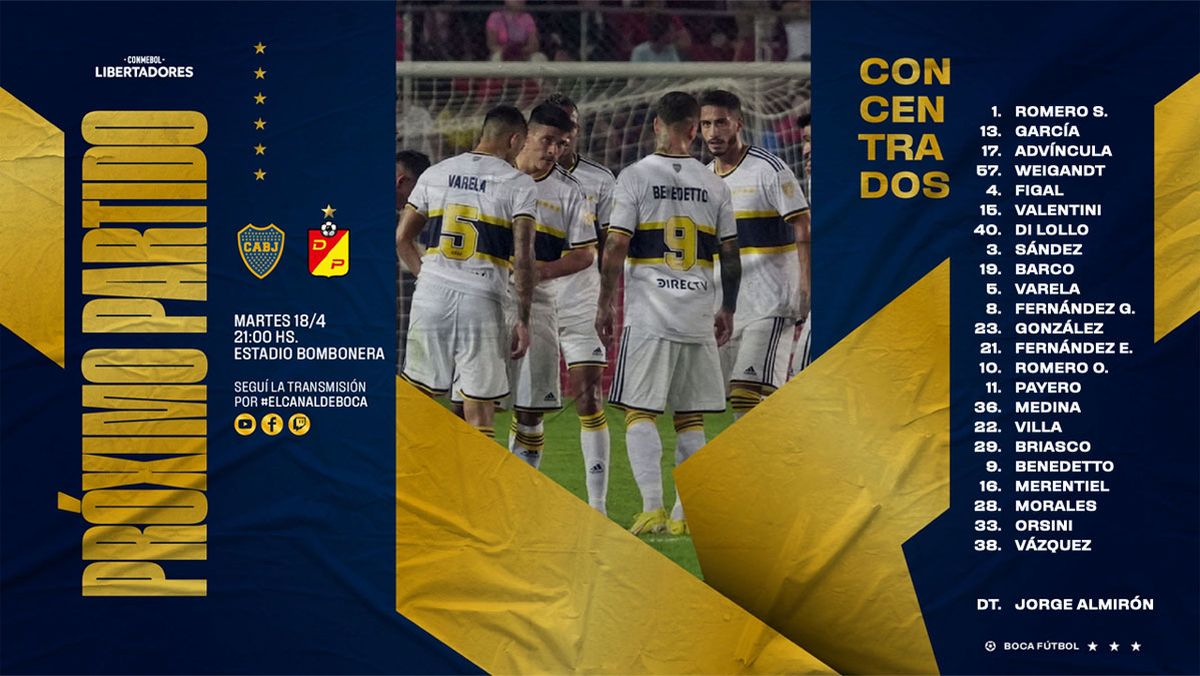 Boca Juniors: Sergio Romero; Luis Advíncula, Nicolás Figal, Nicolás Valentini y Valentín Barco; Guillermo Fernández, Alan Varela y Oscar Romero; Norberto Briasco, Darío Benedetto y Sebastián Villa o Miguel Merentiel. DT: Jorge Almirón.
