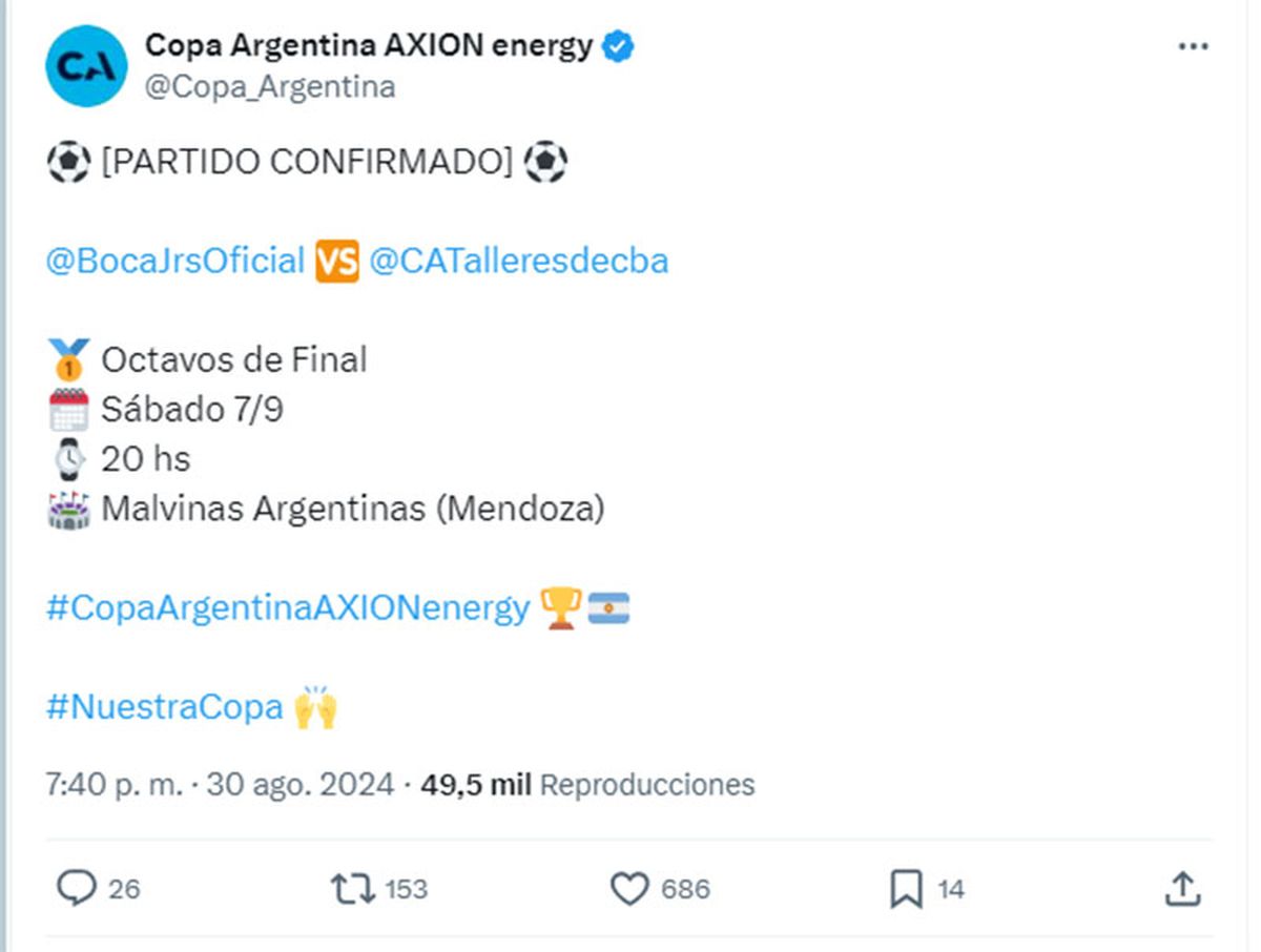 Quedó confirmado este viernes que Boca se medirá con Talleres de Córdoba el sábado 7 de septiembre desde las 20 en el estadio Malvinas Argentinas, por los octavos de final de la Copa Argentina.