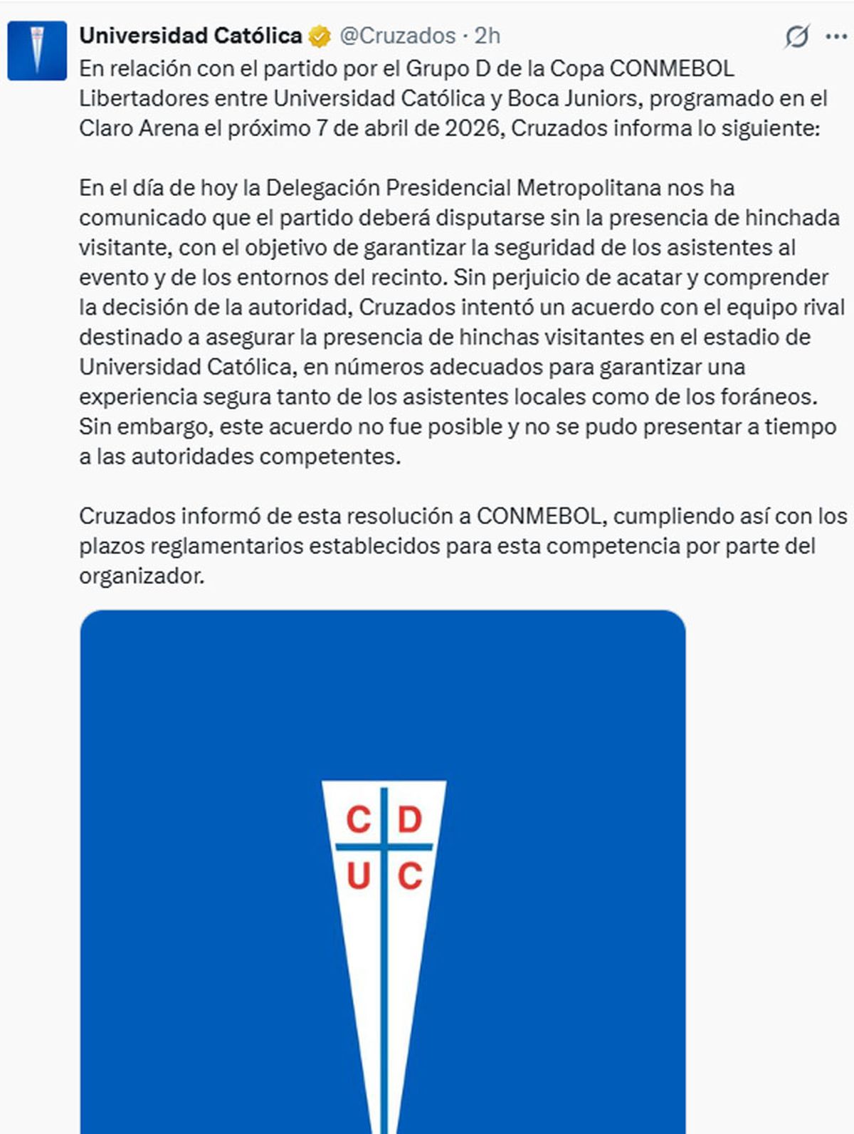 La dirigencia de Universidad Católica confirmó la decisión que tras recibir la notificación de la Delegación Presidencial Metropolitana. La resolución apunta a garantizar la seguridad tanto de los asistentes locales como de los entornos del estadio. El club chileno precisó que, pese a intentar un acuerdo con Boca Juniors para permitir la presencia de hinchas visitantes en condiciones controladas, las propuestas no lograron presentarse a tiempo ante las autoridades correspondientes.