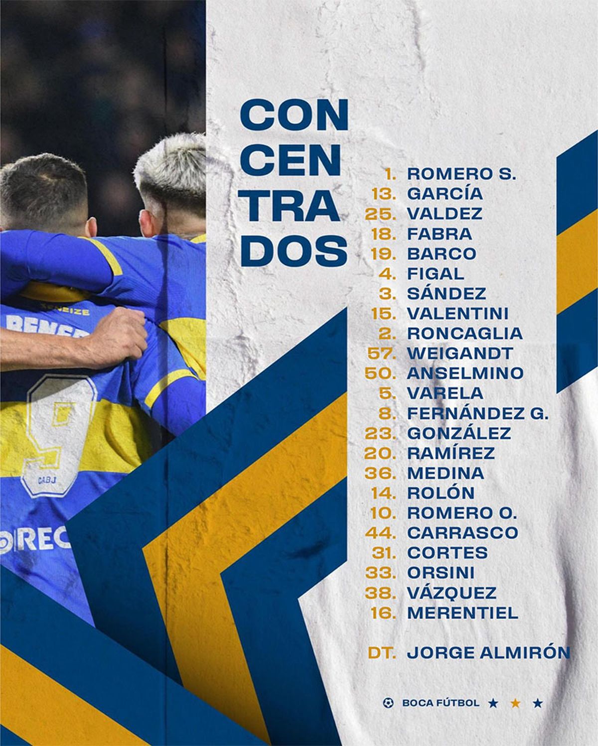 Boca Juniors: Sergio Romero; Marcelo Weigandt, Bruno Valdez, Nicolás Figal y Frank Fabra; Cristian Medina, Alan Varela y Estaban Rolón; Guillermo "Pol" Fernández; Miguel Merentiel y Valentín Barco. DT Jorge Almirón.