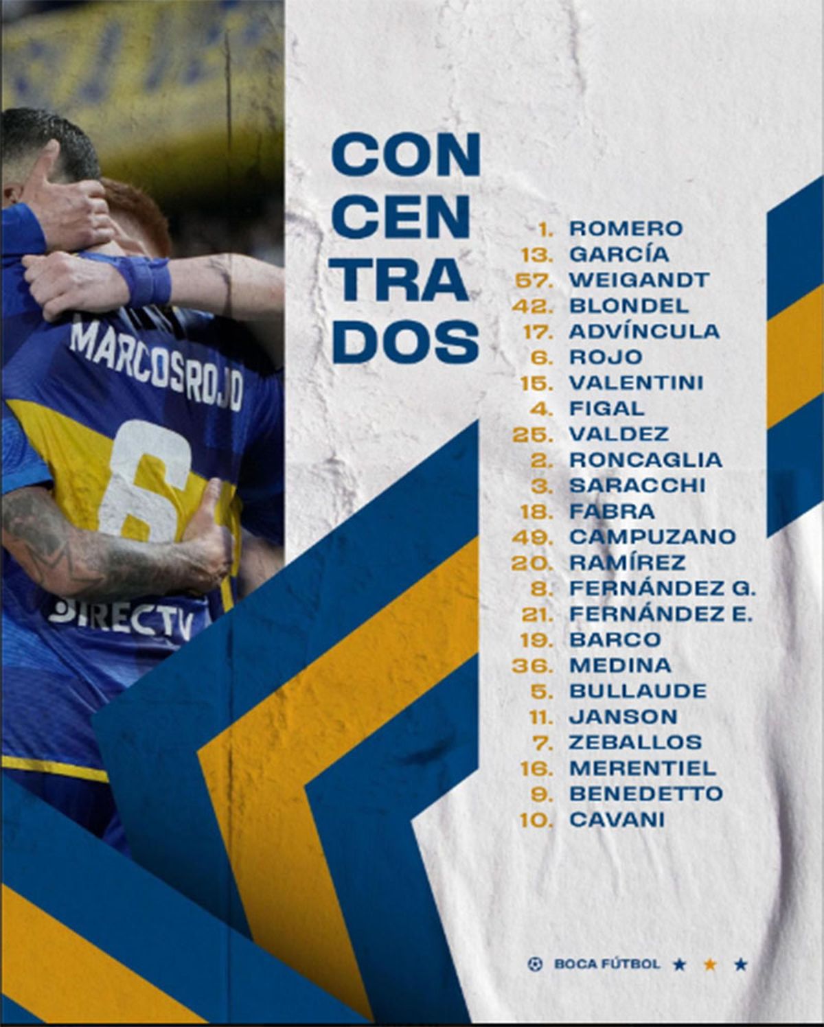 Boca Juniors: Sergio "Chiquito" Romero; Lucas Blondel, Bruno Valdez, Nicolás Valentini y Marcelo Saracchi; Ezequiel Bullaude, Jorman Campuzano y Juan Ramírez; Exequiel Zeballos, Darío Benedetto y Lucas Janson. DT: Jorge Almirón.