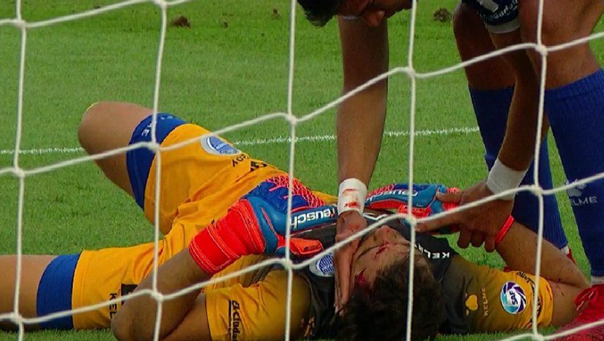 El "uno" bodeguero estaba adelantado y Nahuel Bustos lo vio e intentó marcar desde la mitad de cancha. Bolado se hizo sobre sus pasos y sacó el balón del ángulo, pero se llevó la peor parte ya que se rompió la cabeza con el palo izquierdo.